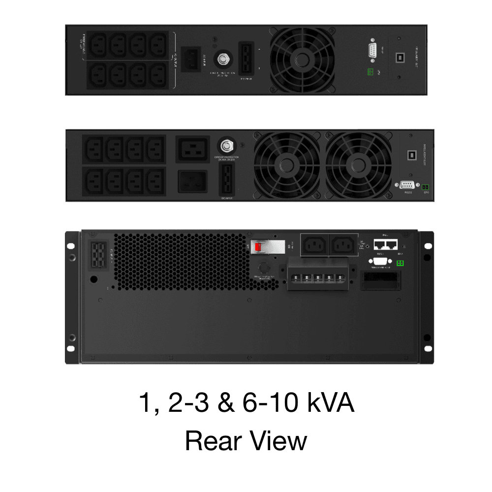 In addition to multiple IEC320 C13 outlets (quantity varies by model), Rehlko PW 1000RM UPS systems also feature RS232 and Emergency Power Off (EPO) connections. A USB slot enables SNMP, RS485 and dry contact options.
